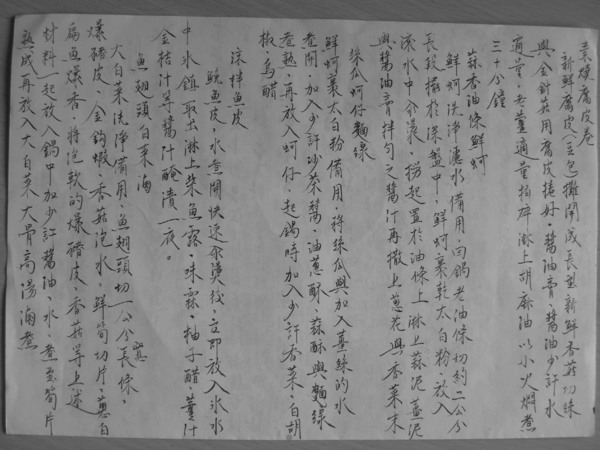 之前的一些小菜食譜 原稿就紙類回收前先照相建檔 素燒腐皮卷、蒜香油條鮮蚵、絲瓜蚵仔麵線、涼拌魚皮、魚翅頭白菜滷 朴菜肉丸子